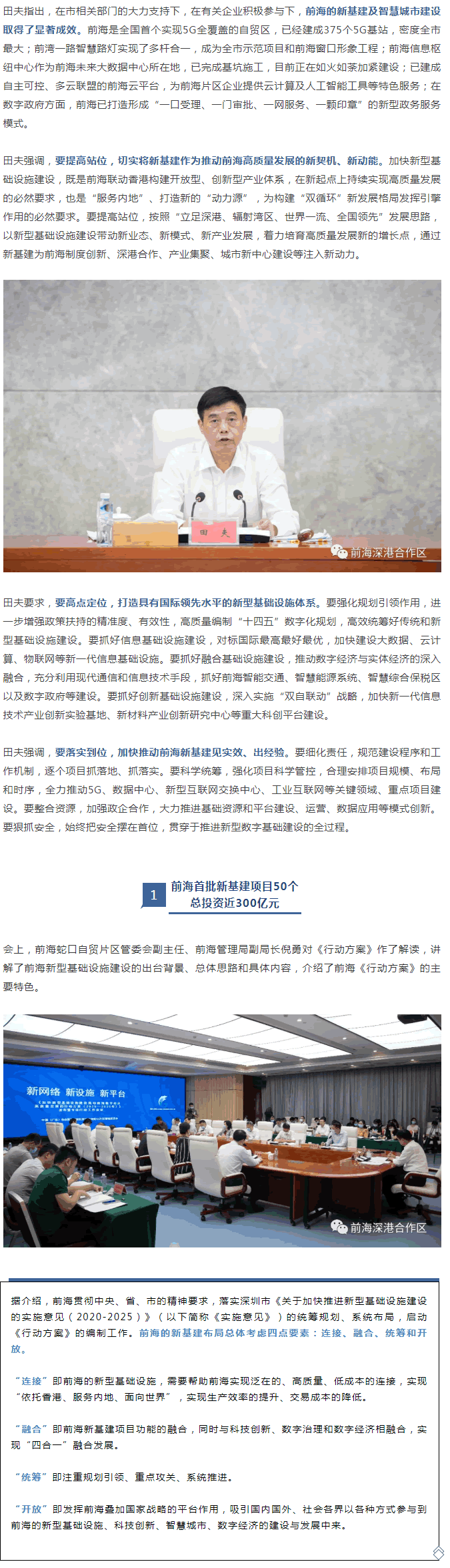 市委常委、前海合作區(qū)黨工委書記、前海蛇口自貿(mào)片區(qū)管委會主任田夫出席會議,宣布《行動方案》正式發(fā)布,并就前海“新基建”作動員部署。市通信管理局局長何承健、市發(fā)展和改革委員會副主任曾堅朋、市工業(yè)和信息化局副局長何志梅、市政務(wù)服務(wù)數(shù)據(jù)管理局副巡視員陳朝祥,前海蛇口自貿(mào)片區(qū)管委會副主任、前海管理局副局長謝暉暉、倪勇出席會議。前海蛇口自貿(mào)片區(qū)管委會副主任、前海管理局副局長劉昌松主持會議。