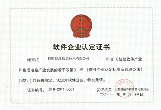 日照創(chuàng)澤信息技術(shù)有限公司于二零一一年四月十八日通過山東省經(jīng)濟(jì)和信息化委員化審核,符合《鼓勵軟件產(chǎn)業(yè)和集成電路產(chǎn)業(yè)發(fā)展的若干政策》和《軟件企業(yè)認(rèn)定標(biāo)準(zhǔn)和管理辦法》有關(guān)規(guī)定,被認(rèn)定為軟件企業(yè)。 頒發(fā)《軟件企業(yè)認(rèn)定證書》,證書編號:魯R-2011-0001 ![]() |