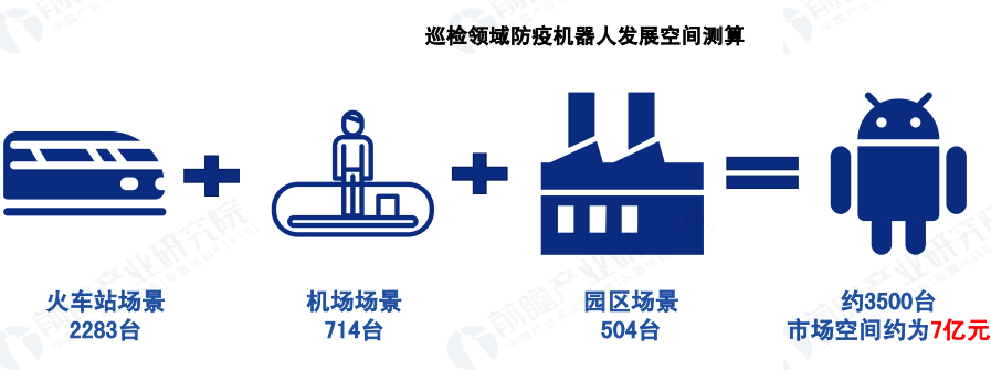 假設三等站配備1臺巡檢機器人、二等站配備2臺、一等站配備3臺、特等站配備4臺、民航機場配備3臺、每個園區配備3臺,巡檢L域防疫機器人的需求量約為3500臺。按照每臺機器人20萬元的價格計算,巡檢L域防疫機器人的市場空間約為7億元。