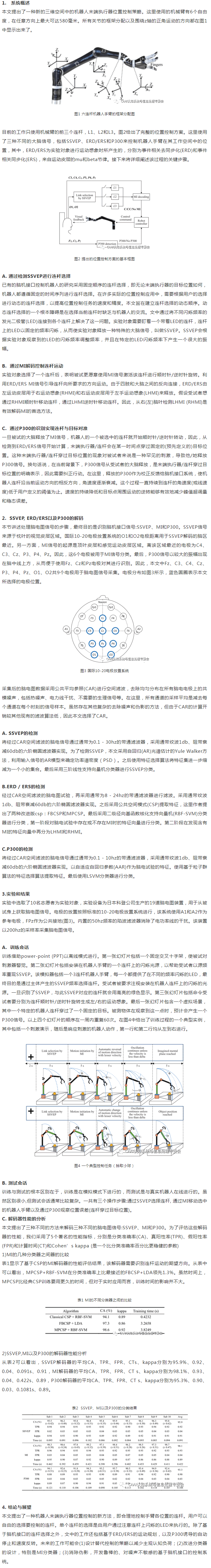 近年來,腦機接口在輔助機器人和康復工程方面的應用日益廣泛,現有的為位置控制應用程序設計的腦機接口存在兩個基本限制。首先,現有的方案大多采用開環控制,因此無法跟蹤位置誤差,導致無法采取必要的在線糾正措施。有一些基于腦電圖(EEG)的位置控制的工作雖然采取了閉環控制,但現這些腦誘導閉環位置控制方案采用的是固定順序的連桿選擇規則,這往往造成瓶頸,阻礙了有效的控制。其次,現有的腦誘導位置控制器被設計成像傳統的一階系統一樣產生位置響應,導致較大的穩態誤差。文中通過穩態視覺誘發電位(SSVEP)實現任意的選擇連桿以達到有效控制,并生成位置控制系統的二階響應,逐步減少過射/欠射,以減少穩態誤差,從而克服了上述兩個限制。文中還提出了利用運動想象(MI)和P300信號來設計混合腦機接口系統,通過在位置誤差的零交叉處使用速度反轉來逐漸減少誤差裕度。