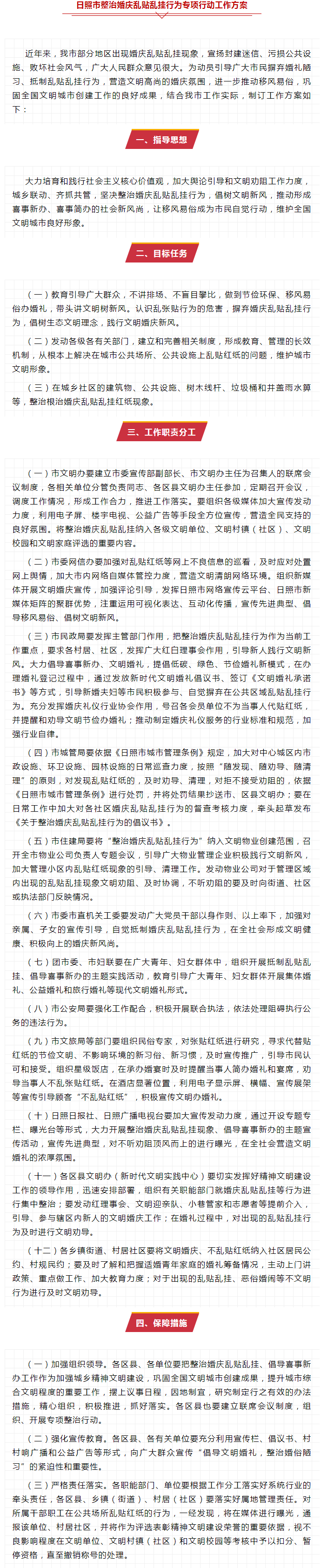 經(jīng)市文明委研究同意,現(xiàn)將《日照市整治婚慶亂貼亂掛行為專(zhuān)項(xiàng)行動(dòng)工作方案》印發(fā)給你們,請(qǐng)結(jié)合實(shí)際認(rèn)真貫徹執(zhí)行。