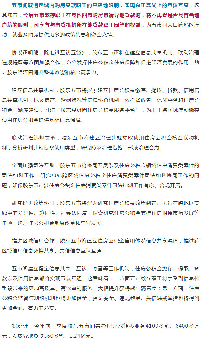 根據協議,膠東五市住房公積金部門將深入推進互認互貸,推動住房公積金轉移接續和繳存信息互認,在尊重五市具體政策措施的基礎上,取消區域內購房貸款職工戶籍地限制,確保申請異地貸款的職工與申貸機構所在地貸款職工享有同等權益。