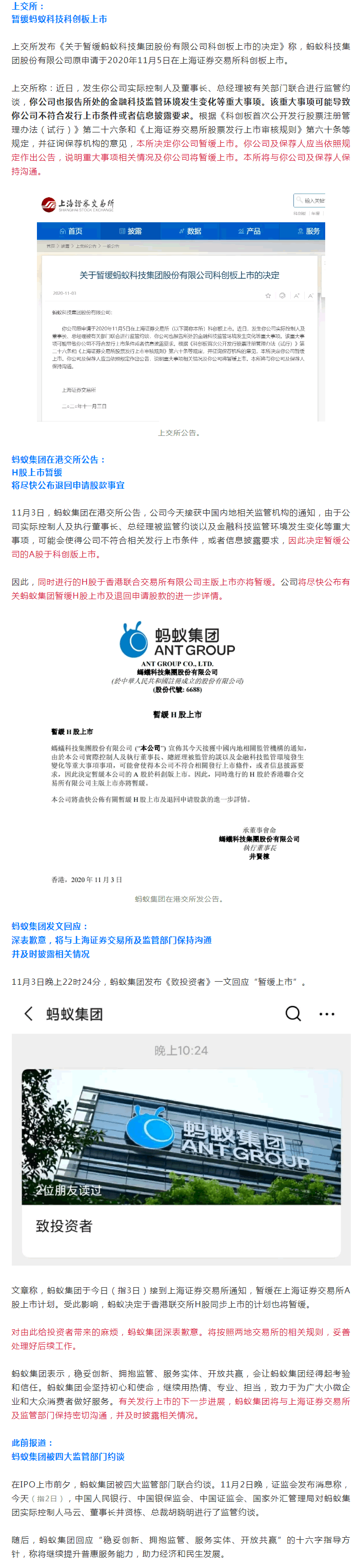 11月3日晚間,上交所公告稱,暫緩螞蟻科技集團股份有限公司科創板上市。隨后,螞蟻集團在港交所發布公告,同時進行的H股于香港聯合交易所有限公司主版上市亦將暫緩。
