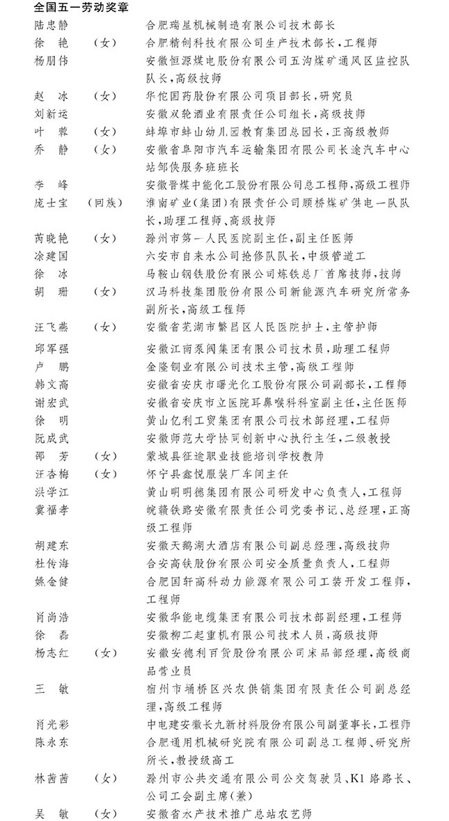 河北省全國五一勞動獎章獲得者56名,白文舉 劉瑞L 張國民 左愛東 李向英 于鴻勝 劉艷平 陳占峰 謝曉星 呂金起