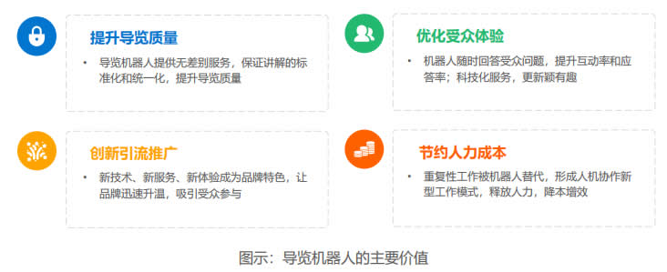 導覽機器人是服務機器人的一種, 主要融合了人工智能、 機械電子、 通信和 傳感器、 計算機等技術, 通過計算控制平臺和人機交互系統(tǒng), 提供室內導航、 語音講解、 信息檢索、 互動問答等多種服務, 已在美術館、 博物館、 政務大 廳、 展廳、 銀行、 商場等場景落地應用。
