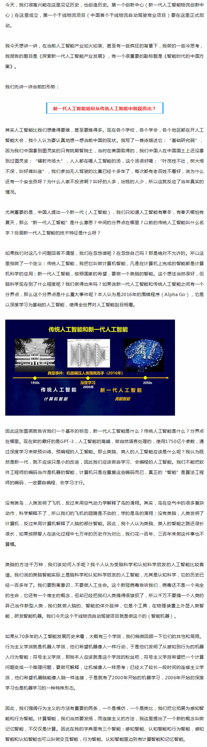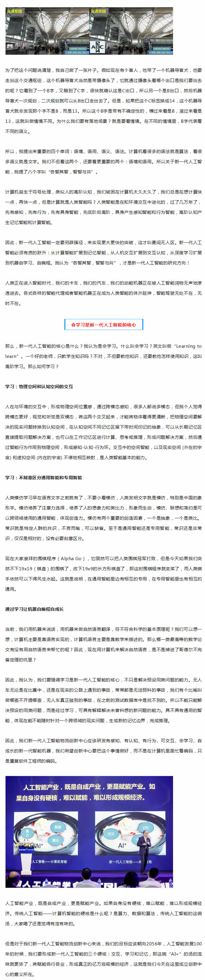新一代人工智能一定要另辟蹊徑,來實現更大更快的突破,這才叫勇闖無人區。新一代人工智能需要有質的躍升:從計算智能擴展到記憶智能,從人機交互擴展到交互認知,從深度學習擴展到機器自學習、自編程。我認為“各智其智,智智與共”,才是新一代人工智能的研究方向!