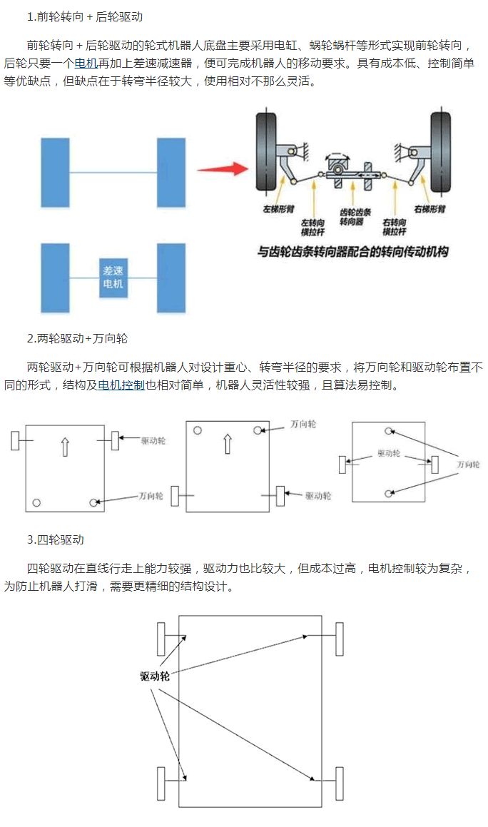 輪式機(jī)器人底盤主要有前輪轉(zhuǎn)向后輪差速驅(qū)動(dòng)、兩輪驅(qū)動(dòng)+萬向輪、四輪驅(qū)動(dòng)之分。