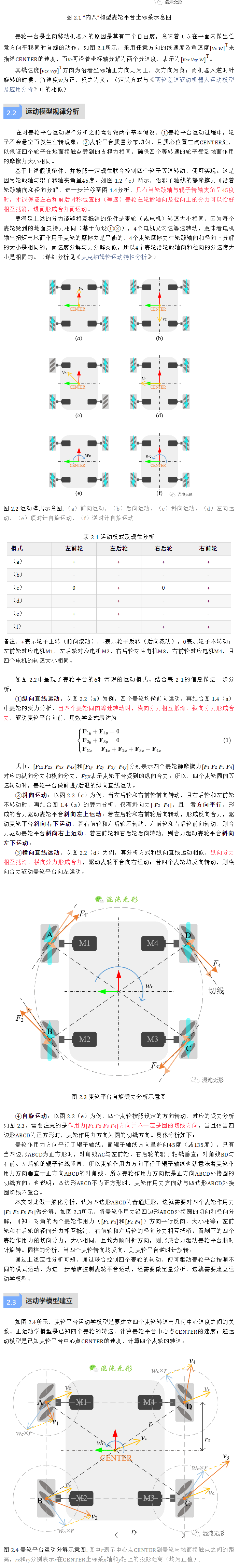 麥克納姆輪平臺(tái)因其優(yōu)異的機(jī)動(dòng)性而備受關(guān)注,本文深入分析麥克納姆輪的運(yùn)動(dòng)機(jī)理及其麥輪平臺(tái)運(yùn)動(dòng)過程中的受力情況,先后分析麥輪平臺(tái)的6種運(yùn)動(dòng)模式及其內(nèi)在運(yùn)動(dòng)規(guī)律;并采用速度分解的方法,詳細(xì)分析了電機(jī)轉(zhuǎn)速-麥輪實(shí)際運(yùn)動(dòng)速度-麥輪平臺(tái)中心點(diǎn)速度之間的關(guān)系,給出完整的物理分析及數(shù)學(xué)推導(dǎo)過程,構(gòu)建麥輪平臺(tái)的運(yùn)動(dòng)學(xué)模型;后從速度空間、運(yùn)動(dòng)效率等方面分析麥輪平臺(tái)的適用場景。