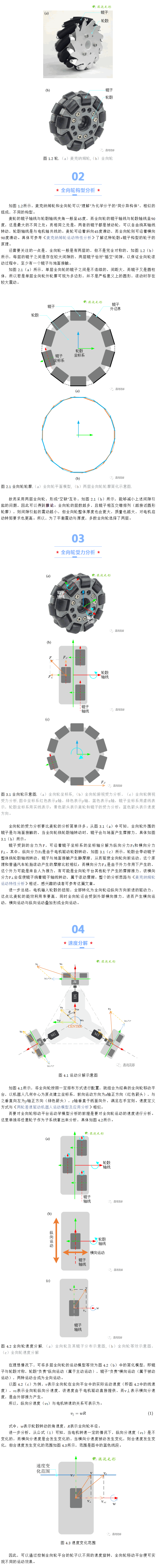本文先描述了全向輪的構(gòu)型及基本特點,接著對單個全向輪進行了受力分析,指出了電機轉(zhuǎn)矩與全向輪所受分力的關(guān)系,并在此基礎(chǔ)上分析了全向輪縱向分速度與電機輸出轉(zhuǎn)速之間的關(guān)系,給出速度分解方程;后,總結(jié)分析了全向輪的在實際使用過程中的特點及問題。
