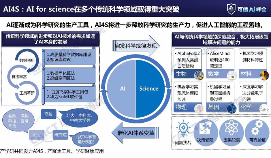 AI for Science在多個傳統科學L域取得重大突破。隨著人工智能技術的快速發展和大規模應用,AI在逐漸成為科學研究新的生產工具,AI4S將進一步釋放科學研究的生產力,促進人工智能的工程落地。一方面,AI與傳統科學L域的深度融合,J大拓展該L域解決問題的能力,目前AI在生物、數學、材料、物理、基因、化學等基礎科學L域都取得了諸多成果和突破,并對科學研究范式產生了深刻的影響,例如,目前人工智能已經能夠預測幾乎所有的生物蛋白質的可能結構,被譽為人類在21世紀取得的重要的科學突破之一,可能開啟“數字生物學”的新時代。另一方面,傳統科學L域的進步和對AI技術的需求加速了AI本身的發展。當前產學研共同發力人工智能與科學的融合,產業界聚焦工具創新,開源工具和基于開源工具產生的創新成果呈爆發趨勢,AI4S的研究范圍也擴展到了更多基礎問題L域。G校和研究院聚焦算法和應用,用AI算法更好地將科學計算和物理模型相連接,進而指導科學與產業創新。