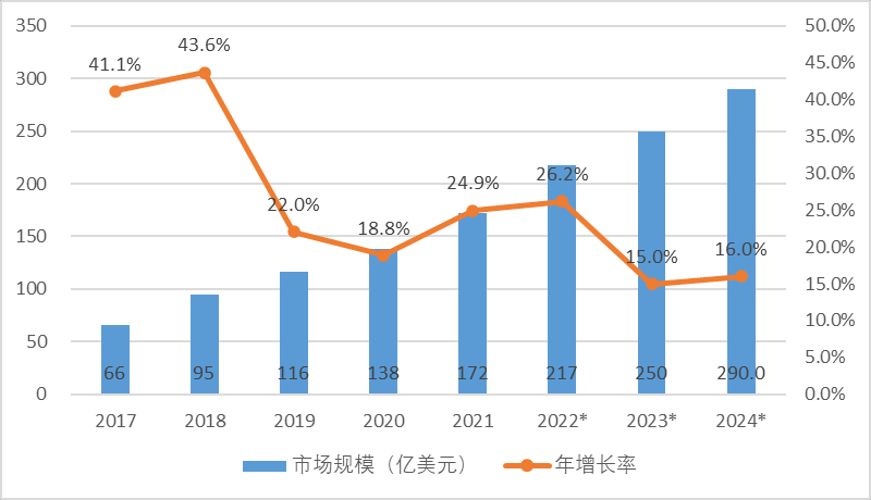 預計 2022 年, 服務機器人市場規模達到 217 億美元。 2024 年, 全 球服務機器人市場規模將有望增長到 290 億美元。