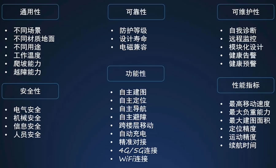 4 功能性:自主建圖、自主定位、自主導航、自主避障、跨樓層移動、自動充電、準確對接、4G/5G連接、WiFi連接。
