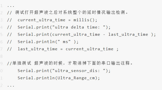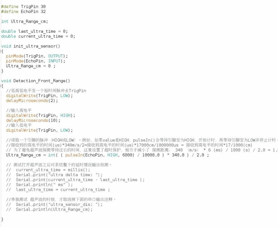 該程序定義了一個存儲測距信息的變量 Ultra_Range_cm , 測距范圍為“0-1m”。此時,我們可以看見下面有兩大段注釋。其中,D一段是用來測試整個系統(tǒng)功能執(zhí)行一遍所需要的時間,若取消掉注釋,即可在 串口監(jiān)視器 實(shí)時查看輸出的時間信息。