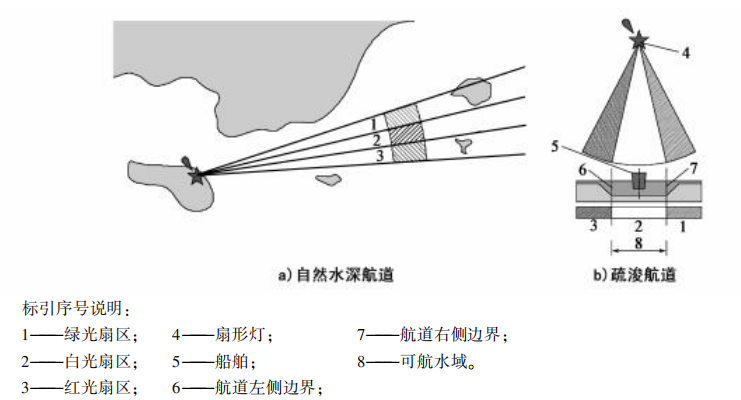 4. 4 當(dāng)用扇形燈標(biāo)示可航水域時(shí),扇區(qū)邊界應(yīng)與可航水域邊界保持一定的安全距離。