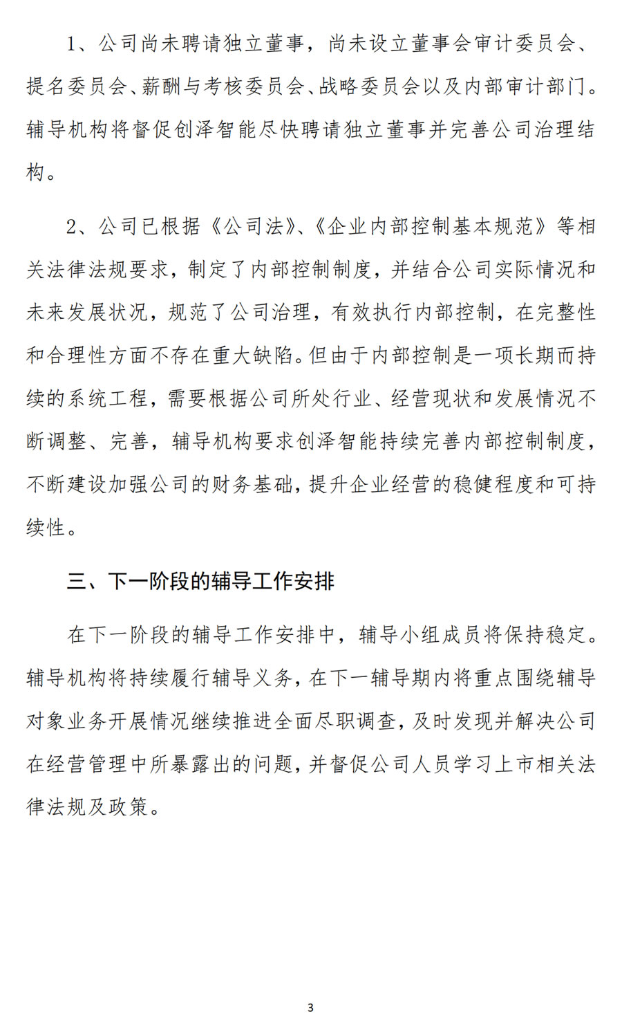 2、公司已根據《公司法》、《企業內部控制基本規范》等相關法律法規要求,制定了內部控制制度,并結合公司實際情況和未來發展狀況,規范了公司治理,有效執行內部控制,在完整性和合理性方面不存在重大缺陷。但由于內部控制是一項長期而持續的系統工程,需要根據公司所處行業、經營現狀和發展情況不斷調整、完善,輔導機構要求創澤智能持續完善內部控制制度,不斷建設加強公司的財務基礎,提升企業經營的穩健程度和可持續性。