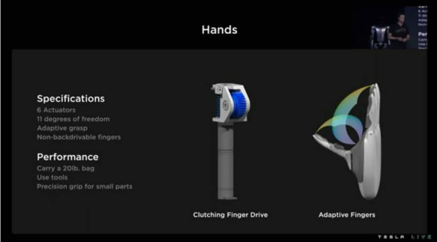 “擎天柱”全身約 50 個自由度,手指靈敏度G,能夠滿足多種規格的物體抓取需求。機器人單手具有 6 個執行器,11 個自由度,在對生拇指與金屬肌腱的配合 下,“擎天柱”能夠完成對不同重量和大小的物件的抓握。同時,特斯拉機械手搭載能夠驅 動手指感知物體的傳感器,幫助其識別需要抓握的物體,并在不斷的抓握過程中學習提G 機械手適應性。