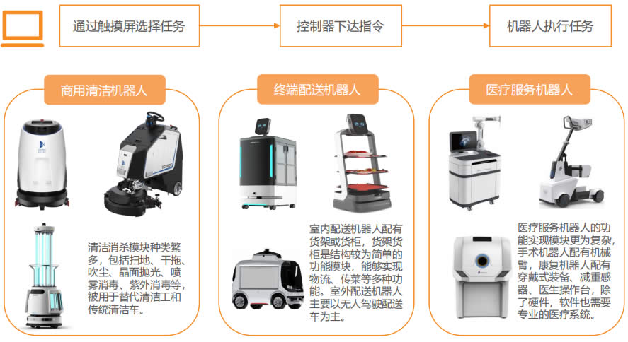 D一類:需要通過觸摸屏選擇任務,控制系統下達指令才能執行任務,例如清潔機器人、終端配送機器人、醫療服務機器人;