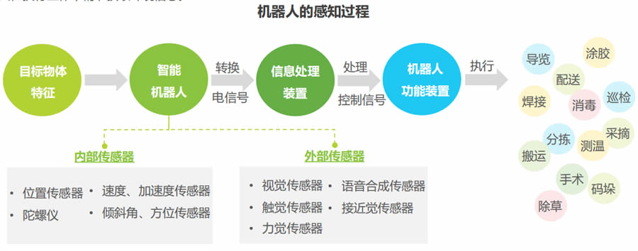 對象的類別,可分為用于測量智能機器人自身狀態(tài)的內(nèi)部傳感器和用于測量與機器人作業(yè)相關(guān)的外部因素的外部傳感器。