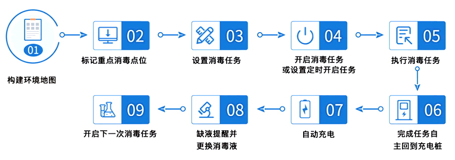 操作人員在遠(yuǎn)程控制器或手機(jī)APP上,設(shè)置消毒區(qū)域和消毒任務(wù),機(jī)器人執(zhí)行消毒任務(wù),通過傳感器感知周圍環(huán)境,驅(qū)動(dòng)移動(dòng)裝置行進(jìn)并避障,同時(shí)噴放消毒噴霧,一旦消毒液不足或電量不足,自動(dòng)回到指定位置,為其加液或充電,直至完成操作人員的設(shè)定任務(wù)。
