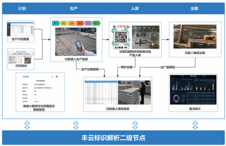 江蘇豐尚智能科技有限公司基于上述痛點(diǎn),與江蘇華晟新型建筑科技有限公司展開(kāi)合作, 開(kāi)發(fā)基于標(biāo)識(shí)的生產(chǎn)質(zhì)資及倉(cāng)庫(kù)管理平臺(tái),將項(xiàng)目信息,構(gòu)件分類(lèi),批次,生產(chǎn)工藝等提前錄 入系統(tǒng),對(duì)接標(biāo)識(shí)解析體統(tǒng)生成符合要求的標(biāo)識(shí)碼。系統(tǒng)結(jié)合生產(chǎn)數(shù)據(jù)的任務(wù)工作蠹,按照工 程建造的構(gòu)件安裝需求進(jìn)度以及工廠既有產(chǎn)能和生產(chǎn)流程,制定工廠構(gòu)件生產(chǎn)計(jì)劃。按生產(chǎn) 線(xiàn)、項(xiàng)目、樓號(hào)、樓層、構(gòu)件類(lèi)型,形成日生產(chǎn)任務(wù)單,提前規(guī)劃生產(chǎn)所需用料。生產(chǎn)過(guò)程 中,用戶(hù)可通過(guò)二維碼對(duì)構(gòu)件生產(chǎn)工藝、構(gòu)件信息進(jìn)行追溯、跟蹤與管理。構(gòu)件生產(chǎn)完成之 后,通過(guò)出色程一掃碼步驟完成質(zhì)檢、貨運(yùn)、信息錄入等多流程的實(shí)時(shí)記錄。庫(kù)位和構(gòu)件信息 都可以通過(guò)PDA端程序?qū)崟r(shí)查詢(xún)。方便臨檢或盤(pán)點(diǎn)人員盤(pán)點(diǎn)。該平臺(tái)部署以來(lái),幫助裝配式建 筑全生命周期信息共享和傳遞,排產(chǎn)計(jì)劃準(zhǔn)確率提升12%,基于數(shù)據(jù)分析大幅提G產(chǎn)品質(zhì)量, 簡(jiǎn)化出入庫(kù)流程,出入庫(kù)時(shí)間縮減30%左右。