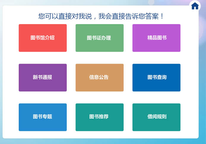 機(jī)器人屏幕主界面是分屏顯示,上部分展示各種媒體的入門(mén)(可點(diǎn)擊進(jìn)入并操作),根據(jù)實(shí)際需求可設(shè)置圖書(shū)證辦理、圖書(shū)館介紹、精品圖書(shū)、信息公告、圖書(shū)查詢和借閱規(guī)則等導(dǎo)航圖標(biāo)。