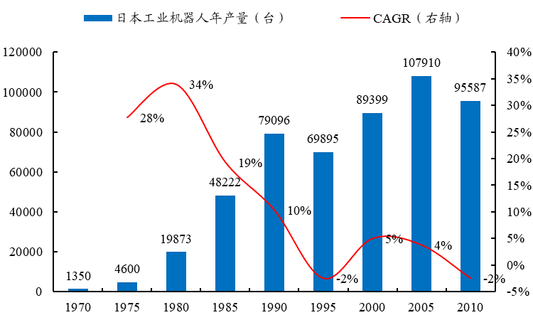 日本工業機器人年產量由 1970 年的 1350 臺猛增到 1980 年的 19843 臺,年均增長率為 30.8%,處于爆發性增長的 初級階段。