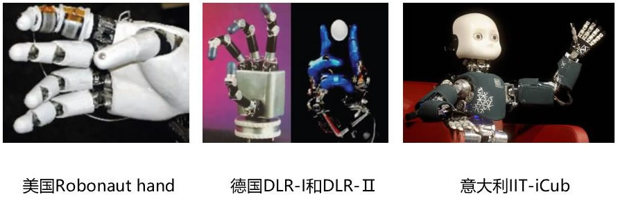 2) 德國宇航中心先后研制成功了 DLR-Ⅰ和 DLR-Ⅱ靈巧手,共集成了 25 個傳感器, 包括類似人工皮膚的觸覺傳感器、關節(jié)扭矩傳感器、位置傳感器和溫度傳感器 等,靈巧手在靈活性和感知能力方面有顯著提升。