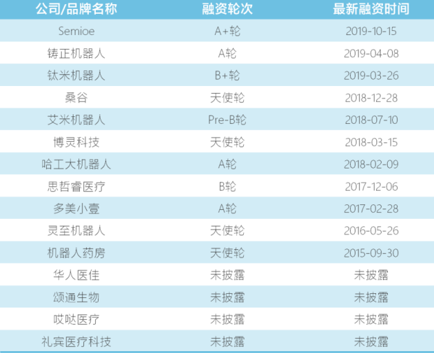 目前,醫用機器人具有廣闊的發展前景,但醫用L域的門檻很G,難以落地。因此,專注于醫療機器人概念的機器人公司正面臨融資困難。從上表可以看出,只有Semioe、casting robot和titanium robot三家公司在2019年完成了一輪的融資,其余公司仍然面臨財務壓力。